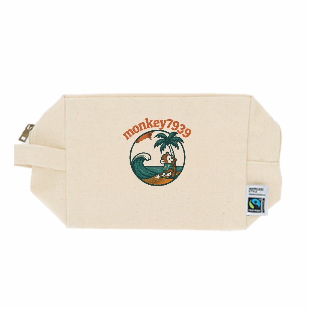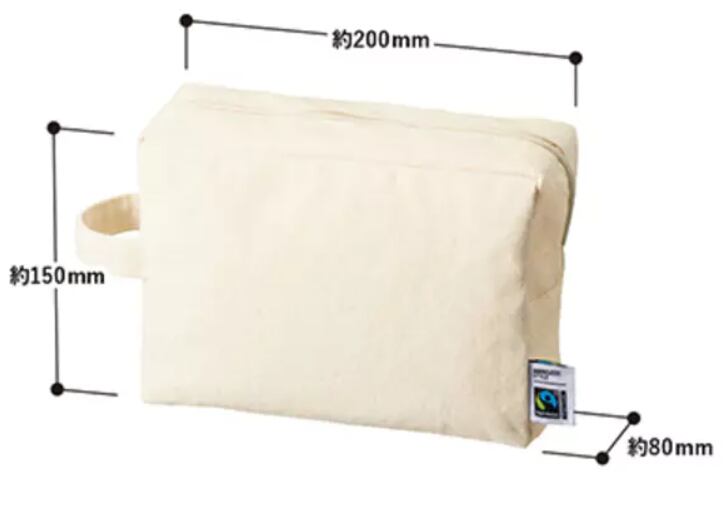 国際フェアトレード認証ラベル付きの、オーガニックコットンを使用したポーチ。
